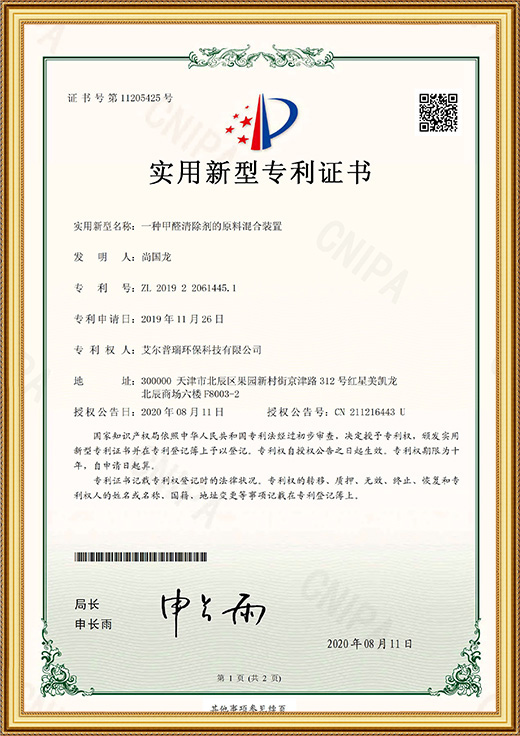 實(shí)用新型專利證書(一種甲醛清除劑的原料存儲